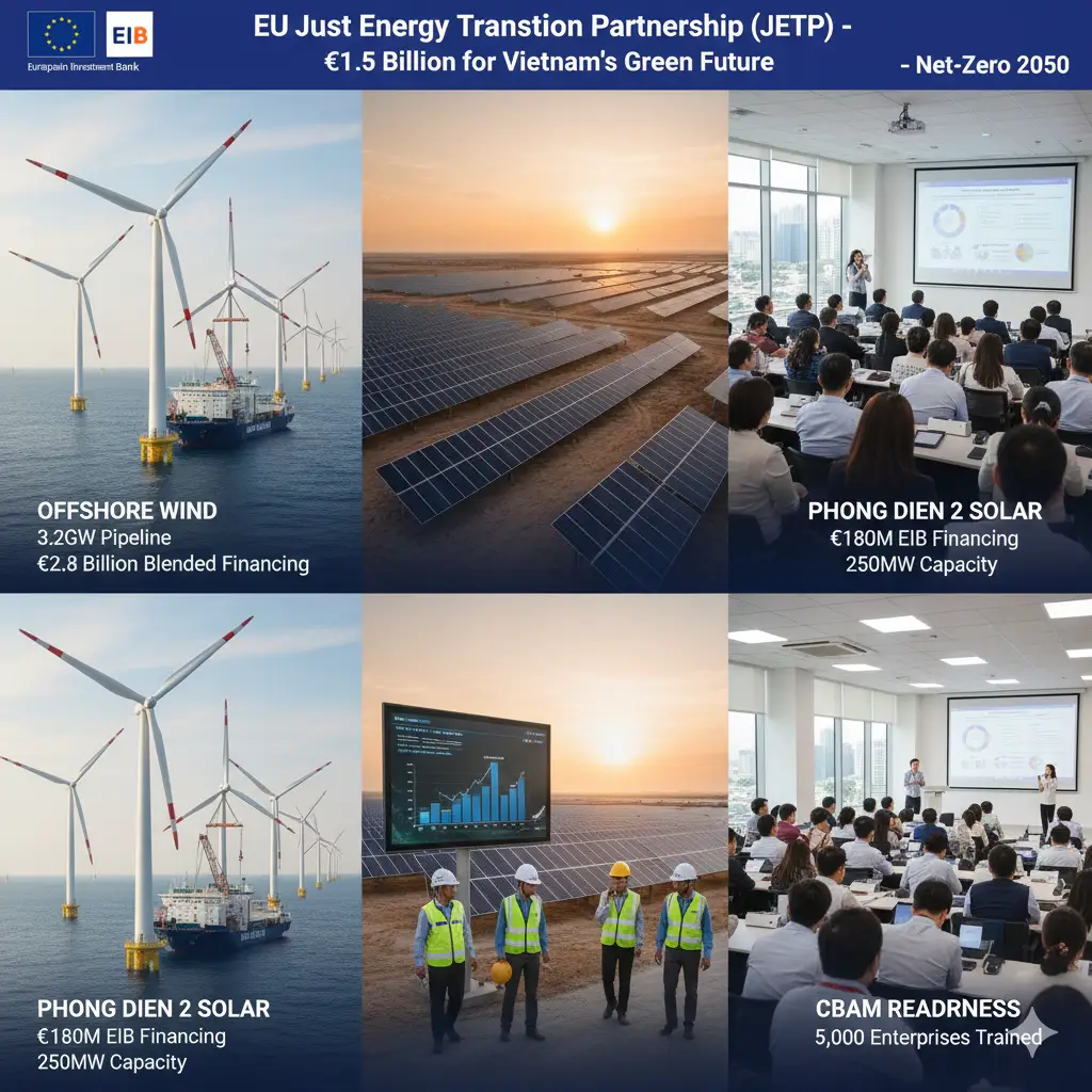 EU Just Energy Transition Partnership JETP committed €1.5 billion grant loan blend Vietnam coal phase-out net-zero 2050 trajectory support mobilisation. Phong Dien 2 solar complex Khanh Hoa €180 million European Investment Bank financing 250MW capacity addition grid stability contributions.