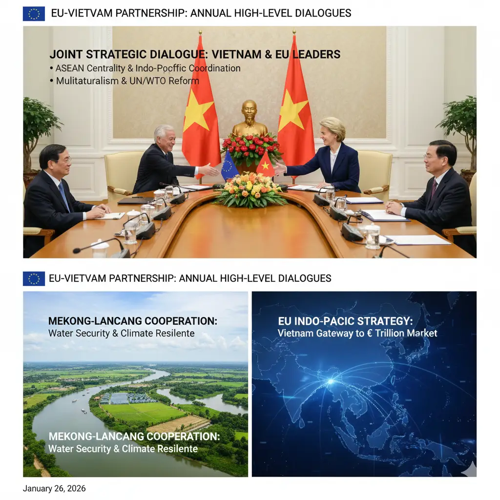 Von der Leyen outlined EU Indo-Pacific Strategy Vietnam gateway positioning Southeast Asia €1 trillion market access facilitation. Joint endorsement Mekong-Lancang cooperation water security climate adaptation agricultural resilience projects portfolio expansion.