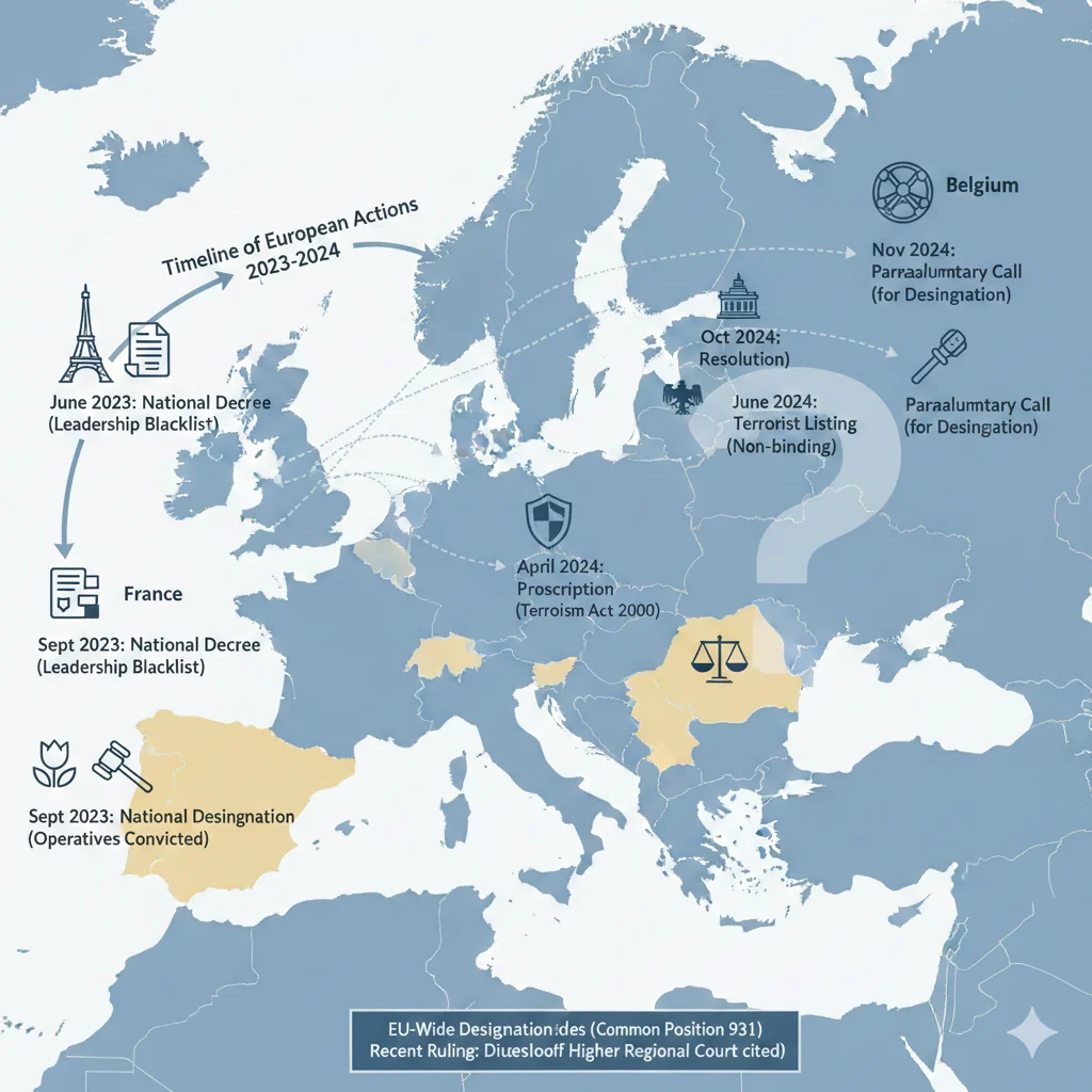 Belgium's parliament called for designation in November 2024 while the UK proscribed the IRGC under terrorism legislation in April 202Austria's interior ministry listed the IRGC as a terrorist entity in June 2024 following the Vienna plot conviction with asset freezes implemented immediately. France issued a national decree in June 2023 blacklisting IRGC leadership after thwarted Paris operations.