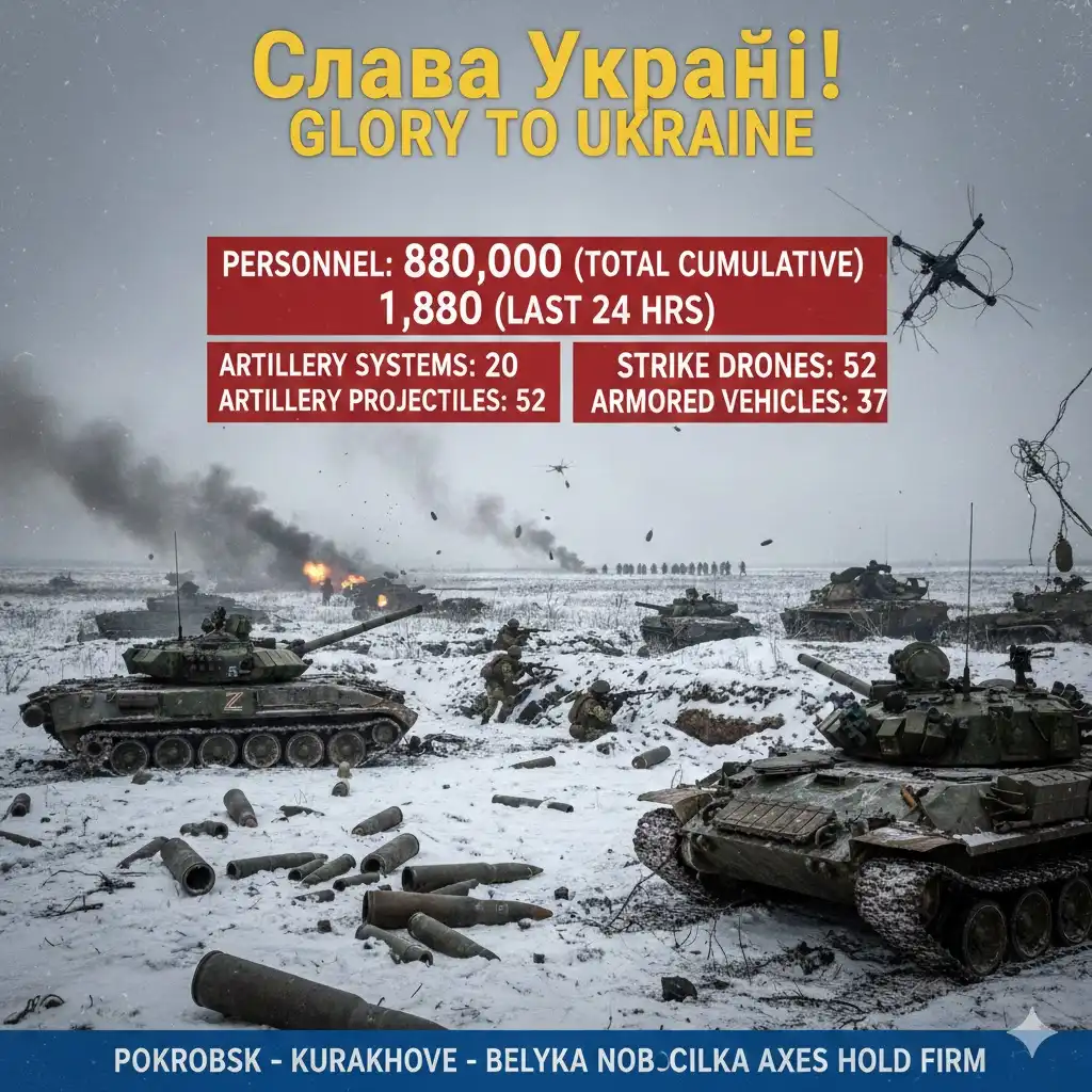 Kyiv (Washington Insider Magazine) January 31, 2026 – The General Staff of Ukraine's Armed Forces reported that Russian troop losses reached 880,000 soldiers killed or wounded as of January 31, with 1,880 personnel eliminated in the previous 24 hours. Ukrainian military sources also documented the destruction of 20 artillery systems alongside 1,200 projectiles, 52 drones and 37 armoured vehicles during intense frontline combat operations. Moscow has not issued official casualty figures, while Western assessments continue to track cumulative Russian losses across multiple fronts.