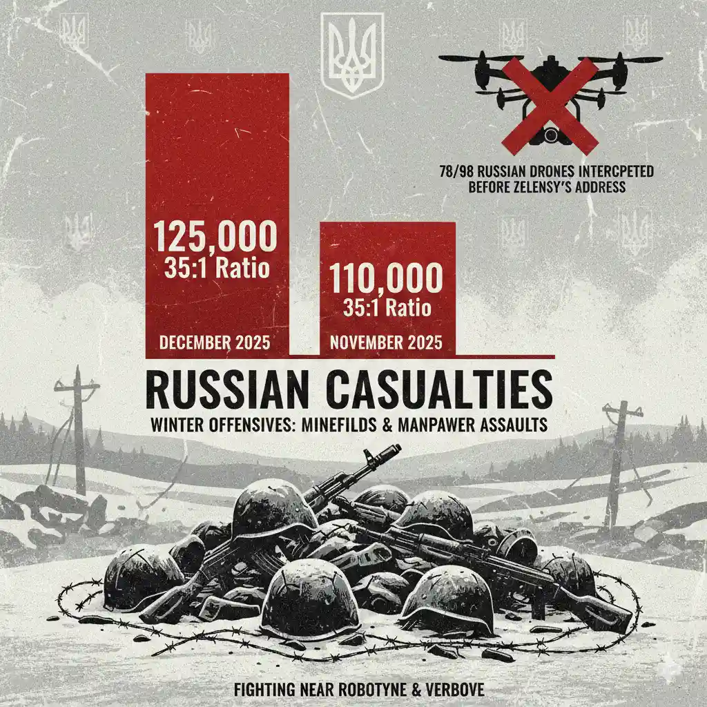 Ukraine recorded 125,000 Russian casualties in December 2025 (35:1 ratio) and 110,000 in November. Russian winter offensives emphasised manpower assaults through minefields, elevating personnel losses.