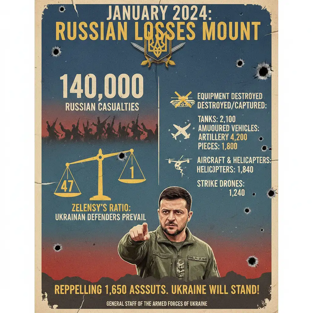 Ukraine's General Staff reported 140,000 Russian casualties during January, translating to Zelensky's 47:1 ratio against Ukrainian deaths. Specific equipment losses included 2,100 tanks, 4,200 armoured vehicles, and 1,800 artillery pieces destroyed or captured.