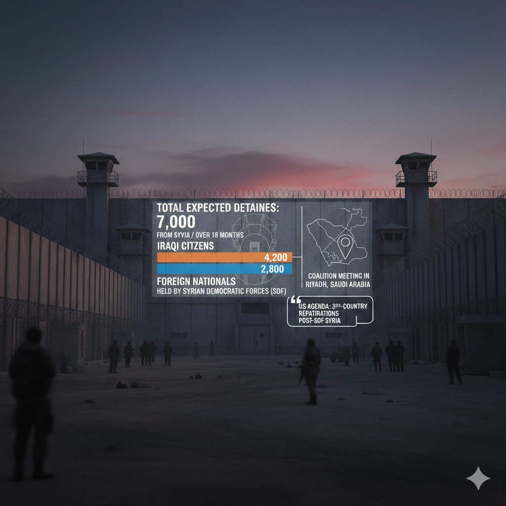 Iraqi government sources project 7,000 ISIL detainees will transfer from Syria over 18 months. The figure comprises 4,200 Iraqi citizens and 2,800 foreign nationals held by Syrian Democratic Forces (SDF).