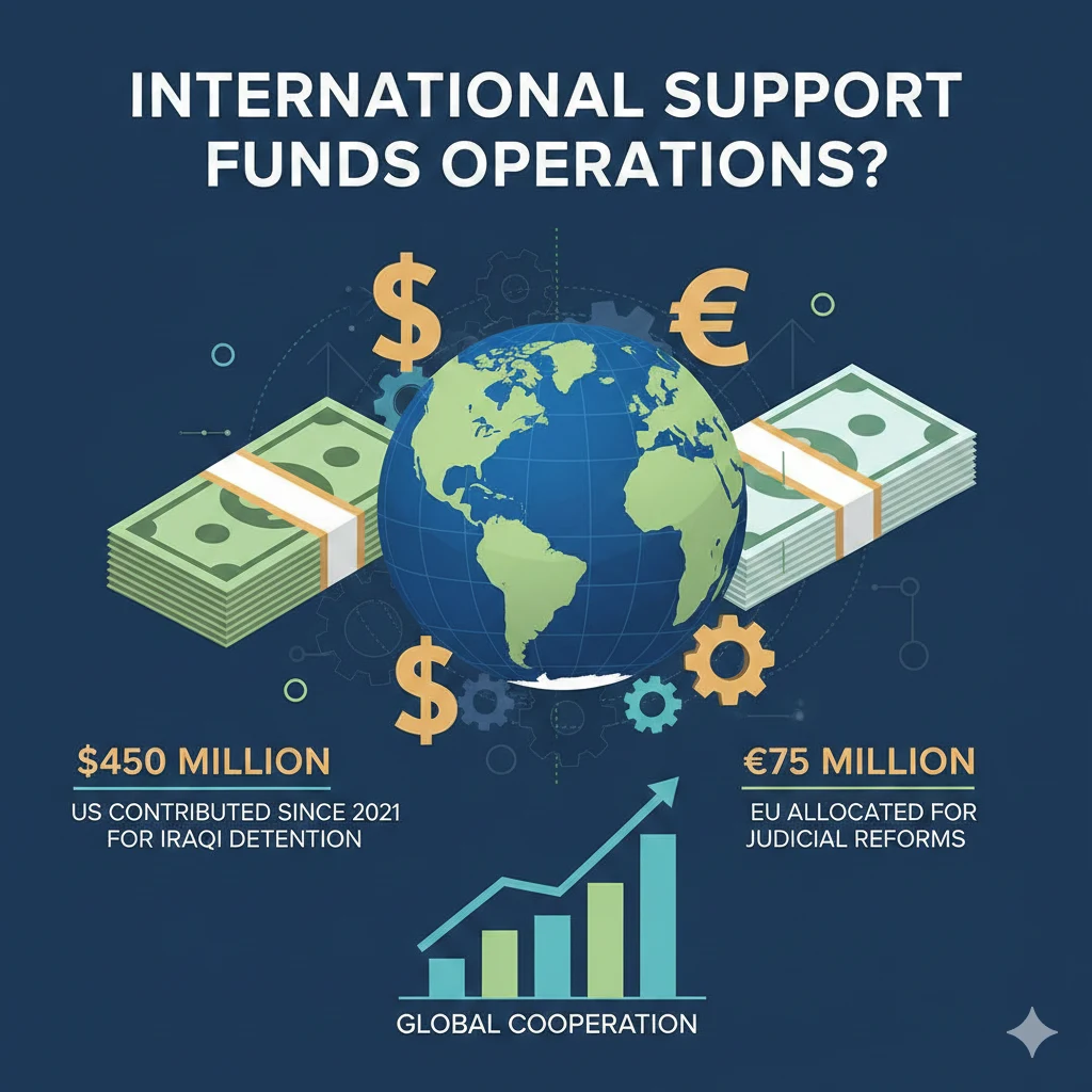 US contributed $450 million since 2021 for Iraqi detention. EU allocated €75 million for judicial reforms.