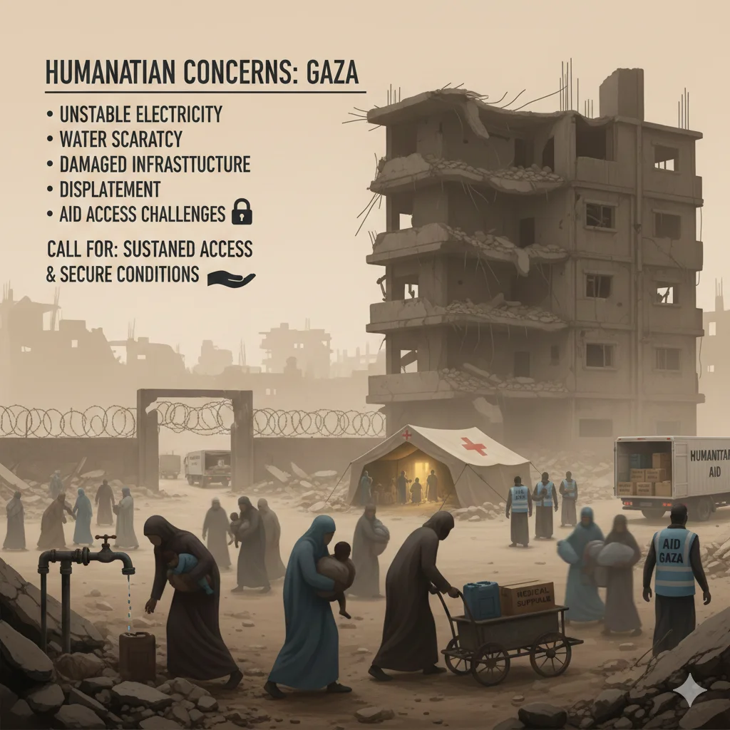 Humanitarian organisations operating in Gaza have highlighted the compounded impact of repeated military operations, movement restrictions and economic constraints on basic services. Electricity supply remains unstable, affecting water pumping, sewage treatment and hospital operations. Damage to housing and civilian infrastructure from strikes can displace families and increase pressure on already crowded living conditions.