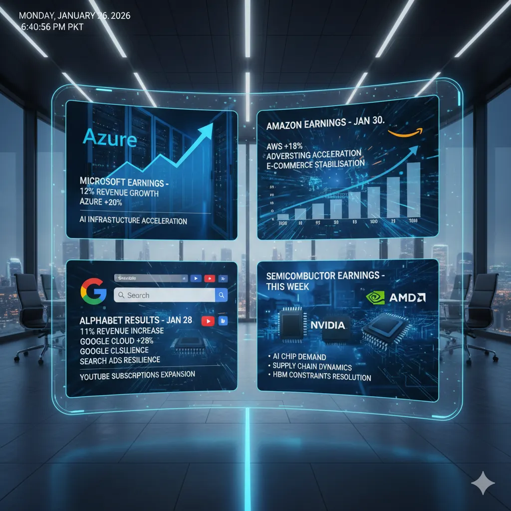 Microsoft reports earnings January 27 after market close analysts forecast 12 percent revenue growth Azure cloud computing segment 20 percent expansion AI infrastructure investments acceleration. Amazon earnings follow January 30 AWS segment 18 percent growth projection advertising revenue acceleration e-commerce stabilisation documentation.