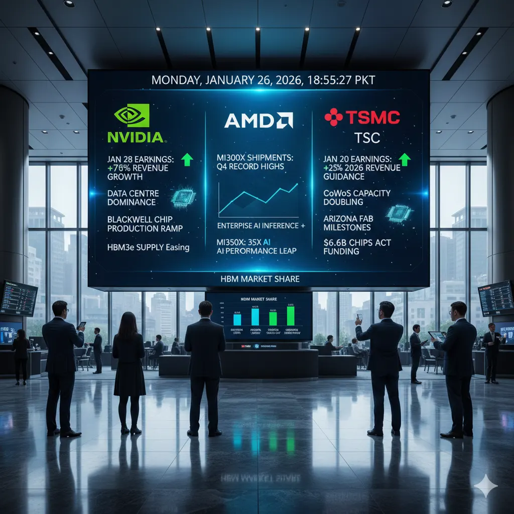 TSMC January 20 earnings confirmed 25 percent 2026 revenue growth guidance CoWoS packaging capacity expansion Arizona fab construction milestones US CHIPS Act funding disbursements. Samsung HBM supply contracts secured Micron high-bandwidth memory market share gains documentation.