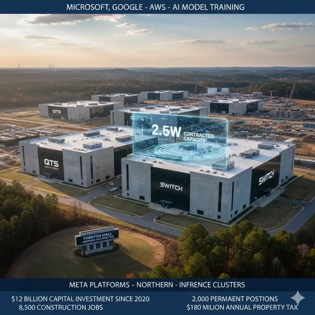 Northern Arc region Forsyth Hall Forsyth counties host 45 operational data centres 2.5 gigawatts contracted capacity Q4 2025. QTS Realty Trust EdgeconneX Switch facilities serve Microsoft Google Amazon Web Services AI model training Meta Platforms inference clusters. Capital investments total $12 billion since 2020 generating 8,500 construction jobs 2,000 permanent positions property tax revenues $180 million annually.