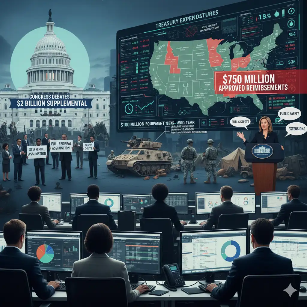 The National Guard Bureau processes reimbursement claims, with $750 million approved to date. Stafford Act provisions enable disaster-related funding, though civil unrest classifications limit eligibility. Congress debates a $2 billion supplemental appropriation in February sessions.