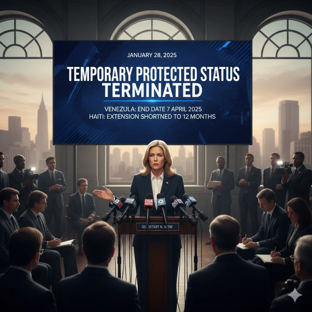 Secretary Noem announced the termination of TPS protections for Venezuelans on 28 January 2025, cancelling extensions granted under prior administrations. She vacated the 17 January 2025 extension of Venezuela’s TPS designation through 2 October 2026 and fully terminated the 2023 designation, setting an end date of 7 April 2025 for beneficiaries under that programme. Noem determined that extending TPS was contrary to the national interest, citing improved conditions in Venezuela and describing national interest as an expansive standard.